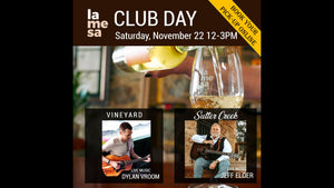 Join us for our Club Day and celebrate the amazing fall season. Pick-up your club release and try our latest vintages. at the Vineyard, live music featuring Dylan Vroom on the terrace (weather permitting). At Sutter Creek, live music featuring Jeff Elder.